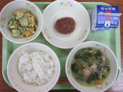 「鶏ピリ辛焼き」は、朝からトウバンジャンやニンニクが入った調味液に漬け込んだ鶏肉を、オーブンで焼いたそうです。トウバンジャンのピリッとした味付けで、ご飯をよりおいしく食べることができました。「五色和え」は、彩り豊かで見た目も楽しみました。
