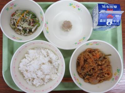 鶏のピリ辛焼き、五色和え、中華スープ、麦ご飯、牛乳