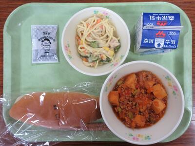 厚揚げのミートソース煮、スパゲティサラダ、黒豆きなこクリーム、コッペパン、牛乳