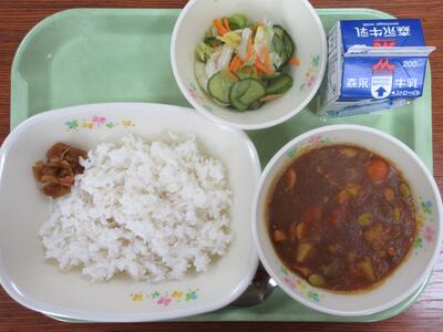 今日は子供たちが大好きな「カレーライス」です。カレーにつきものの「福神漬け」は7種類の野菜を細かく刻み、みりん醤油に漬け込んだものです。7種類の野菜を使うことから、「七福神」にちなんで「福神漬け」と名付けられたそうです。今日の福神漬けは、益城町で作られたもので、国産の野菜を使い、無添加で作られたものだそうです。