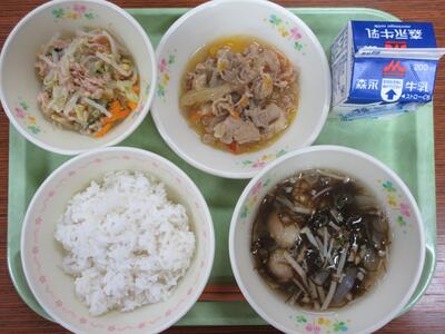 豚肉のショウガ炒め、ゴーヤとツナのサラダ、もずくのスープ、麦ご飯、牛乳