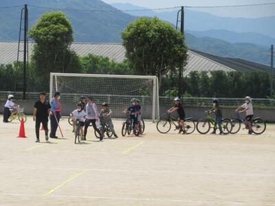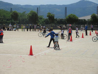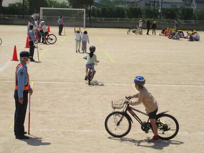 1・2年生は主に歩道の歩き方や横断歩道の渡り方について、実際に学校周辺の道路を使って実施しました。また、3~6年生は運動場で自転車の乗り方を中心に学習しました。