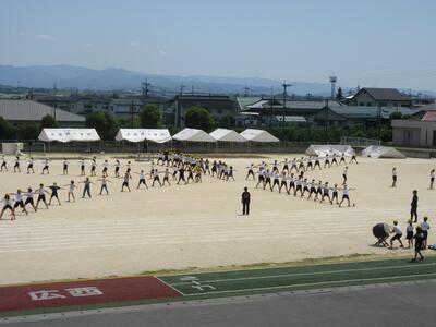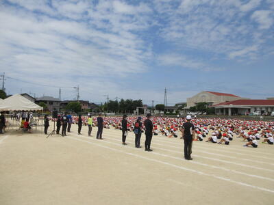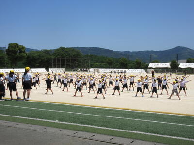 今日(5月23日)は晴天に恵まれ、運動会の全体練習を計画どおり運動場で実施することができました。全体練習2回目の今日は、開会式と閉会式の動きの練習をしました。