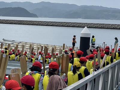 「ペーロン船体験活動」の様子です。チームで声を掛け合いながら、力を合わせて頑張っています。