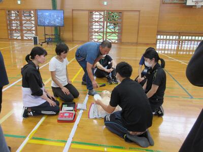 昨日(5月30日)はプール掃除を行い、来週からは各学年で水泳学習が始まります。子供たちも楽しみにしていると思いますが、いざという時に備えて、今日(5月31日)は熊本市消防局から3名の方に講師として来校していただき、心肺蘇生法の職員研修を実施しました。