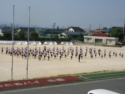 今日(5月23日)は晴天に恵まれ、運動会の全体練習を計画どおり運動場で実施することができました。全体練習2回目の今日は、開会式と閉会式の動きの練習をしました。