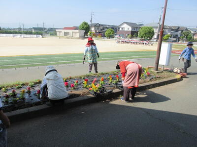 来週土曜日(5月27日)に予定している運動会が気持ちよく迎えられるようにと、今日(5月17日)は老人会や保護者のみなさんが、学校の花壇に花の苗を植えてくださいました。きれいな花がたくさん植えられた花壇を見て、子供たちも大喜びです。本当にありがとございました。