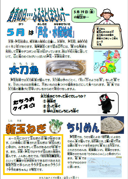 今月は今日(5月19日)が「ふるさとくまさんデー」で、「芦北・水俣」地域の特産品である「太刀魚」「新玉ねぎ」「ちりめんじゃこ」が使われた料理が登場しました。