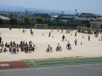1・2年生は主に歩道の歩き方や横断歩道の渡り方について、実際に学校周辺の道路を使って実施しました。また、3~6年生は運動場で自転車の乗り方を中心に学習しました。