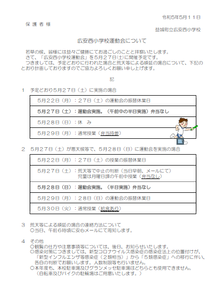 広安西小では5月27日(土)に運動会を計画しています。昨年までの3年間は3学年ごとに分かれて開催しましたが、今年は以前のように全学年で一斉に実施します。