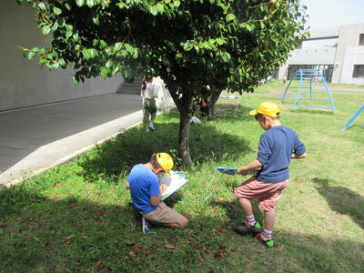 広安西小学校には、校舎と体育館に囲まれた中庭があります。ここは芝生に覆われ、いろいろな生き物の観察もできる素敵な場所です。休み時間だけでなく、理科や生活科の授業でもよく使われています。