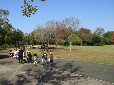 先週の月曜日(11月13日)と今日(11月20日)は、秋の自然について学習するために、それぞれ2クラスずつで校区に隣接する「香りの森」に出かけました。ここは、その名のとおり四季折々の樹木や草花の香りを楽しむことができる施設で、広い敷地内には花や葉に香りのある植物が多数植栽されています。