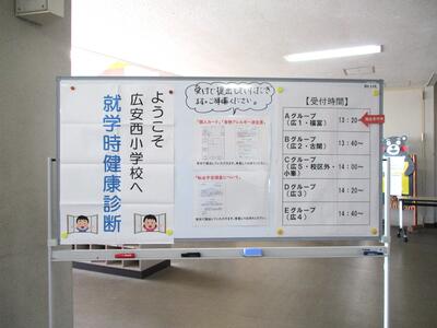 広安西小には、来年度は130名が入学する予定です。その子供たちがよりよい健康状態で入学するために、今日(11月21日)は教育委員会が主催する「就学時健康診断」が行われました。写真は受付が始まる前の様子です。