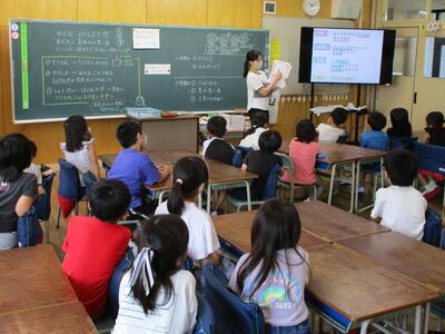 始業式では、はじめに5名の転入生を紹介した後、校長から「夏休みを振り返って」と「2学期にがんばってほしいこと」について話をしました。「2学期にがんばってほしいこと」では、2学期に計画されている見学旅行(1~4年)や集団宿泊教室(5年)、修学旅行(6年)などを紹介した後に、「6つの『あ』」と「友だちを大切に」という話をしました。最後に、「あいさつ標語」や「郡絵画展」の表彰をしました。