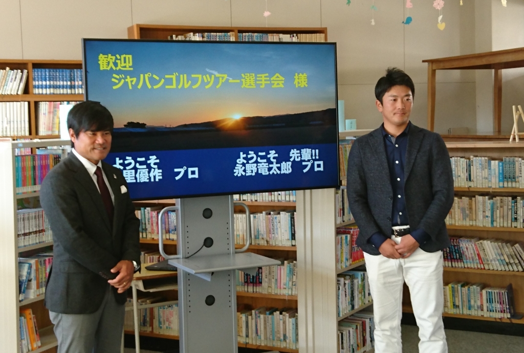 津森小・木山中学校出身の永野隆太郎プロと、2月にスナッグゴルフを一緒にした宮里優作プロから、ジャパンゴルフツアー選手会を代表して木山中に来校され、広安西小学校に大型電子パネル4台を復興支援としていただきました。