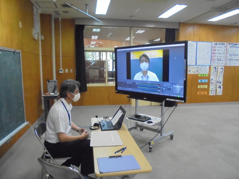 しかし、全ての活動が「いつも通りに」という訳にはいきません。1時間目に行われた全校集会は体育館に集合するのではなく、テレビモニターを使ったライブ配信形式で行いました。