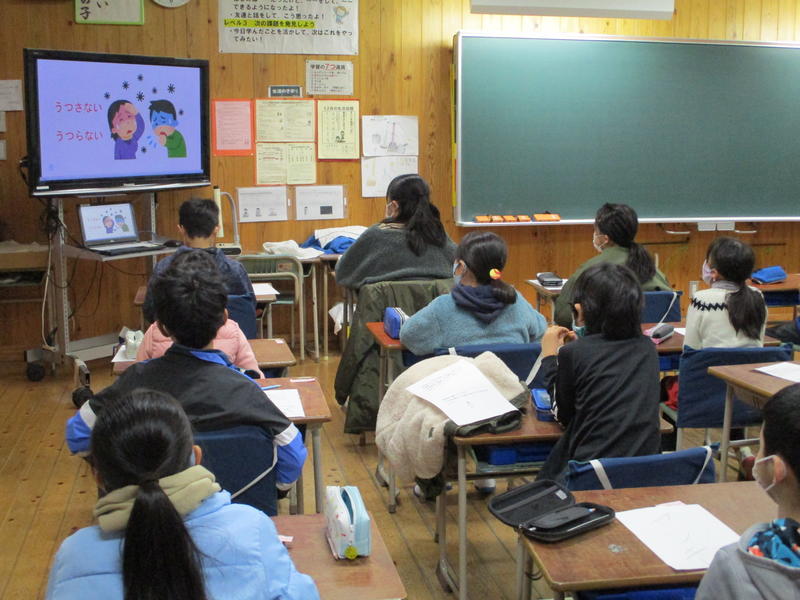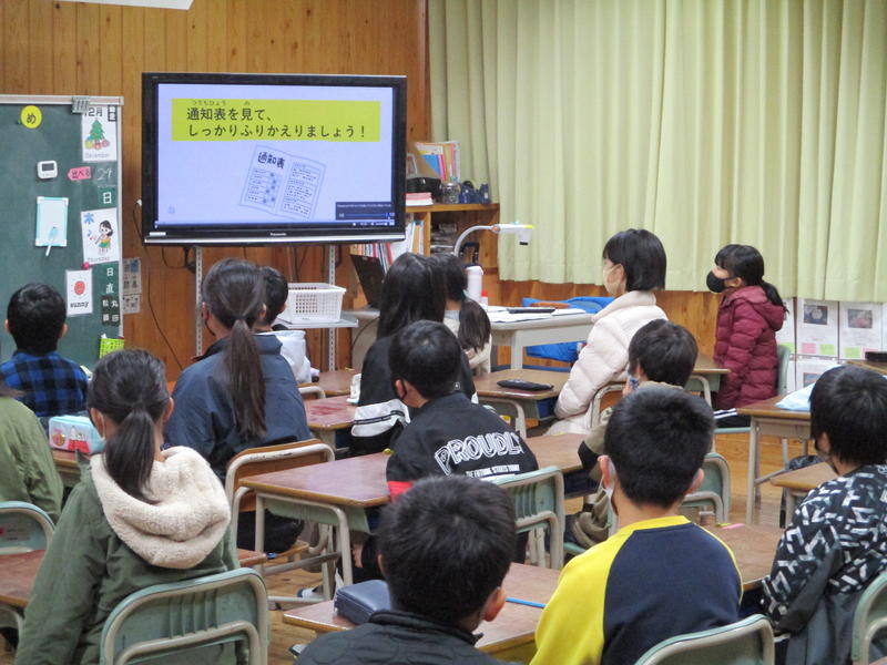 続いて生徒指導担当から冬休みの生活、養護教諭から冬休みの健康な過ごし方について話がありました。教室の子どもたちは集中して話を聞くことができました。