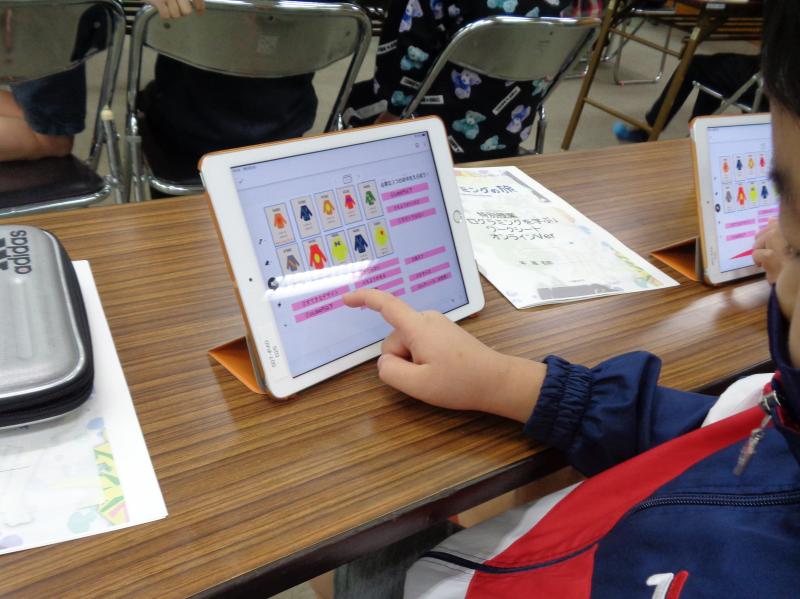 「プログラミングとは?」「プログラム(命令)のコツは?」などの基礎的な知識について、ワークシートやタブレットを使ってゲーム感覚で楽しく学ぶことができていました。