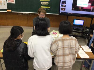 また、今日の1年生と3年生の外国語の授業では、サンタクロースに扮したALTの先生による、クリスマスクイズやクリスマスカード作りなどがありました。
