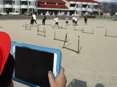 ハードルをリズミカルに跳び越えながら走り通すために、ハードルの高さやハードル間の距離が様々なコースの中から自分に合ったコースを選び、繰り返し練習しました。また、友だちにタブレットを使って走る様子を撮影してもらい、自分の動きを確認したり、友だちにアドバイスをもらったりすることもできました。