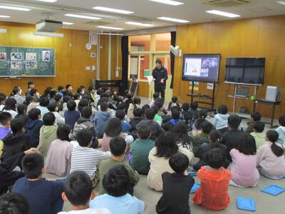 昨日(12月14日)は6年生が県外の小学校と「リモート英語交流会」をしましたが、今日(12月15日)は5年生の外国語の授業で、他校でも指導されているALT(外国語指導助手)の先生方3名に来校していただき、英語での交流会を開催しました。
