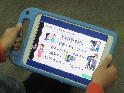 広安西小の5年生では、社会科「情報産業とわたしたちのくらし」の学習を深めるために、今日(12月6日)は地元のテレビ局と学校をオンラインでつなぐ「リモート見学」に取り組みました。