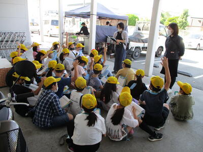 今日(10月12日)は、3年1組と2組の子供たちが社会「店ではたらく人」の学習を深めるために、益城町内にあるスーパーマーケットと野菜や鮮魚などを売っている小売店へ見学に行きました。