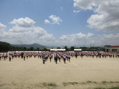 今日(5月23日)は晴天に恵まれ、運動会の全体練習を計画どおり運動場で実施することができました。全体練習2回目の今日は、開会式と閉会式の動きの練習をしました。