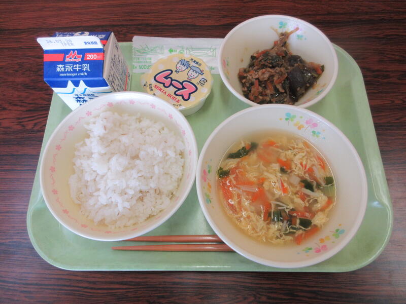 本日の献立は、麦ごはん、牛乳、トック入りの中華スープ、なすのオイスターソース炒め、ムース です。