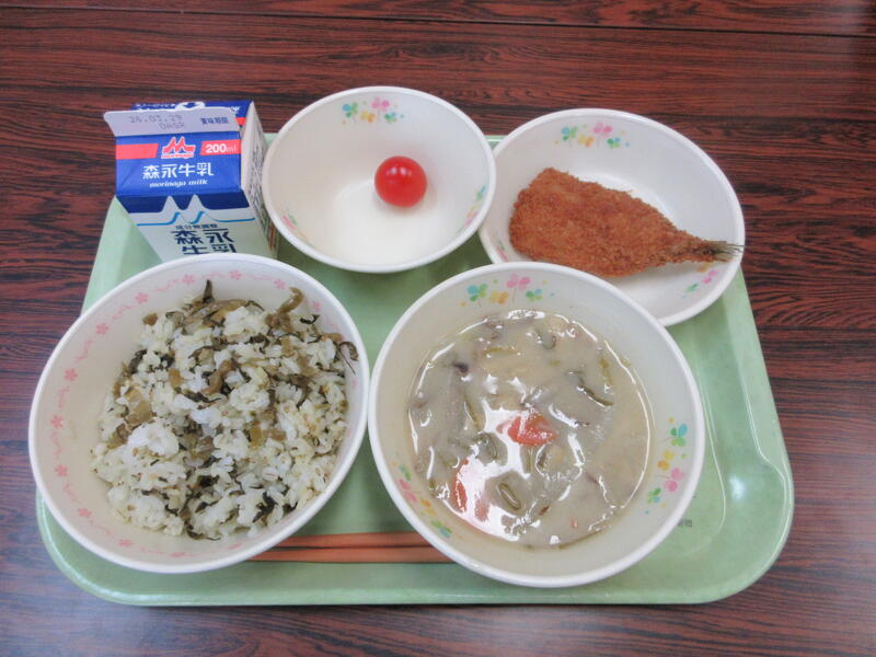 今日の献立は、高菜ごはん、牛乳、みそだご汁、いわしフライ、ミニトマト です。