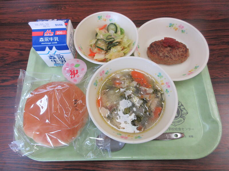 本日の献立は、丸パン、牛乳、ABCスープ、ハンバーグ、ベジチップサラダ、お祝いミニゼリー です。