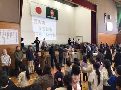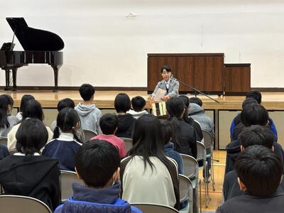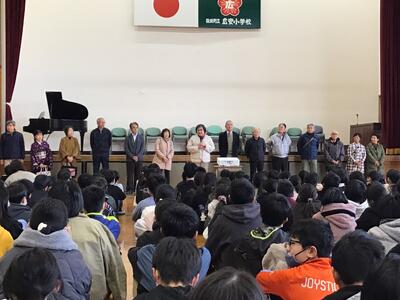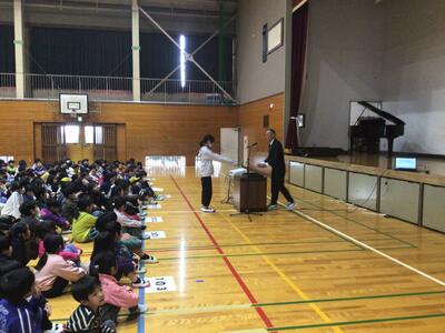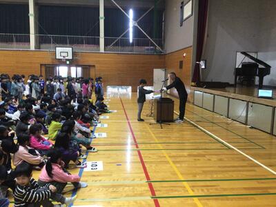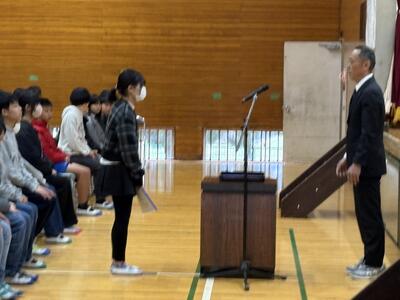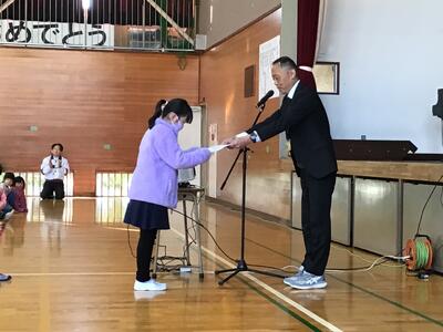 今日は、まず表彰式がありました。「郡絵画・版画展」の入賞者を代表して6年1組山本葵子さんが賞状を受け取りました。次に、「県発明工夫展」のTKU賞を4年3組倉岡悌永さん、「JA書道展」の条幅の部銅賞・半紙の部銀賞を3年2組田崎未來さんの表彰がありました。
