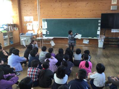まず、視聴覚室で学芸員の方から、益城町図書館の説明をスライドで行っていただきました。子どもたちが驚くような情報をたくさん盛り込んでいただいたお話だったので、子どもたちは「えー!」「おー!」など、興味津々で話を聞いていました。