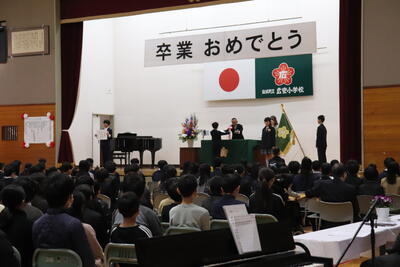 本田先生から「タブレットの正しい使い方」、田添先生から「学習の七つ道具」について話が合った後、最後に6年生が「平和の誓い発表」を行ってくれました。145人の力強いメッセージと歌声が体育館に響き渡り、下級生(特に5年生)は真剣な表情で見つめていました。