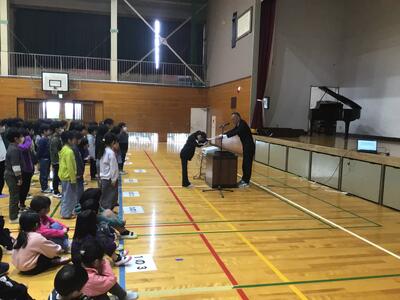 次に、清田先生が「KAMI技・グランプリ」を紹介しました。このグランプリは上益城郡内の小学生が、縄跳びで競ったり交流したりする取組です。最後には体育委員会のみんなが短縄のデモンストレーションを見せてくれました。