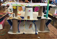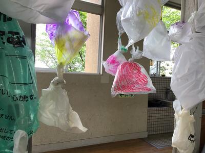 図工の学習で、ビニール袋をふくらませて、積み木のようにして子どもたちと創作活動を行いました。子どもたちは、ふくらませたビニール袋をつなげたり、ふくらませたりして様々なものを想像しながら創作することができました。活動の様子もとても楽しそうでした。