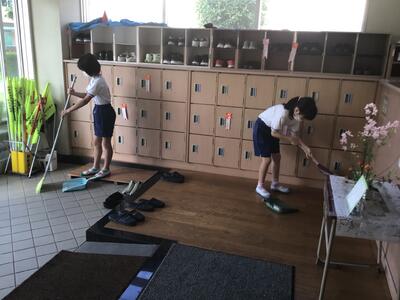 朝の時間に、職員玄関前を毎日きれいにそうじしてくれています。私はこれを朝ボラ(朝のボランティア活動)と呼んでいます。一人一人が、自分にできることを考え、行動していくことでよりよい学校に近づくと思います。この3年生に燈った灯を他の学年にも広げていきたいと思います。
