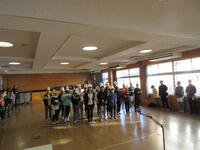 本田先生から「タブレットの正しい使い方」、田添先生から「学習の七つ道具」について話が合った後、最後に6年生が「平和の誓い発表」を行ってくれました。145人の力強いメッセージと歌声が体育館に響き渡り、下級生(特に5年生)は真剣な表情で見つめていました。