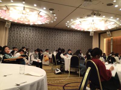 みんなお風呂でさっぱりして、夕食会場の大広間に集合しました。まずは入館式です。