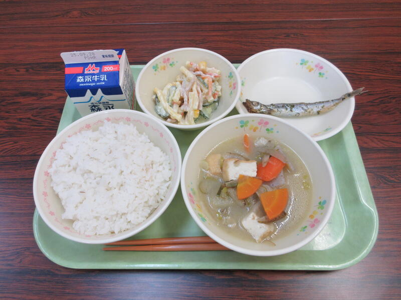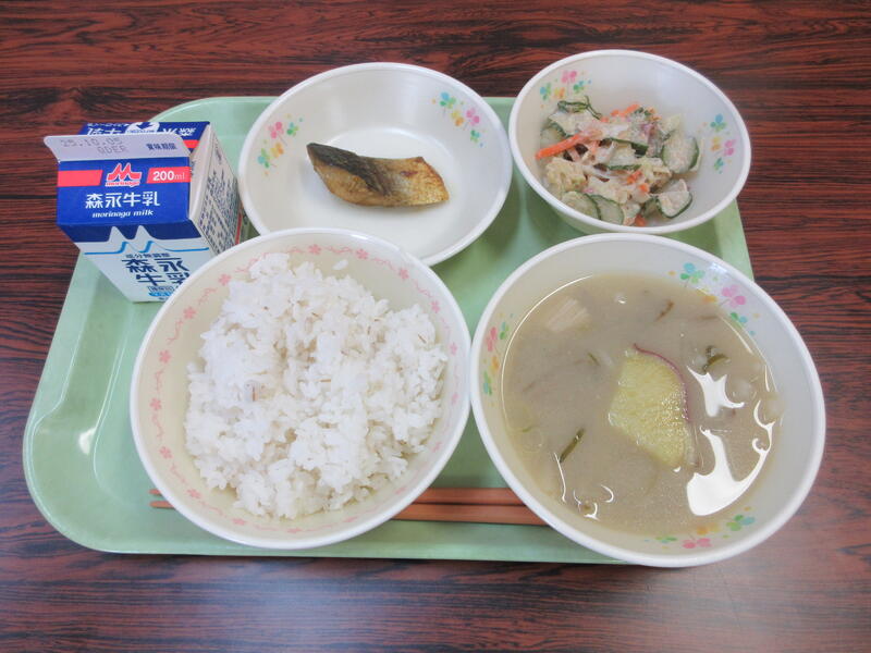 今日の献立は、麦ごはん、牛乳、さつま汁、さばのカレーしょうゆ漬け、野菜の梅まよ和え です。