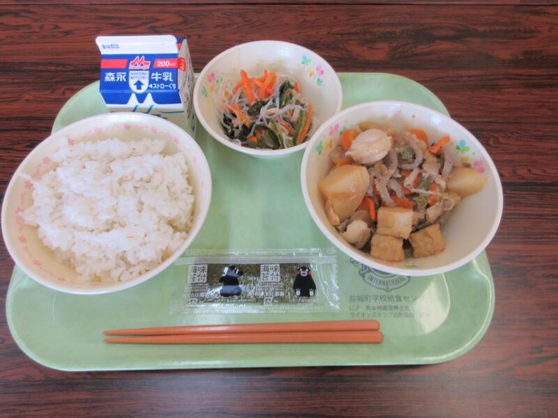 今日の献立は、麦ごはん、牛乳、五目肉じゃが、春雨の酢の物、一食のり です。