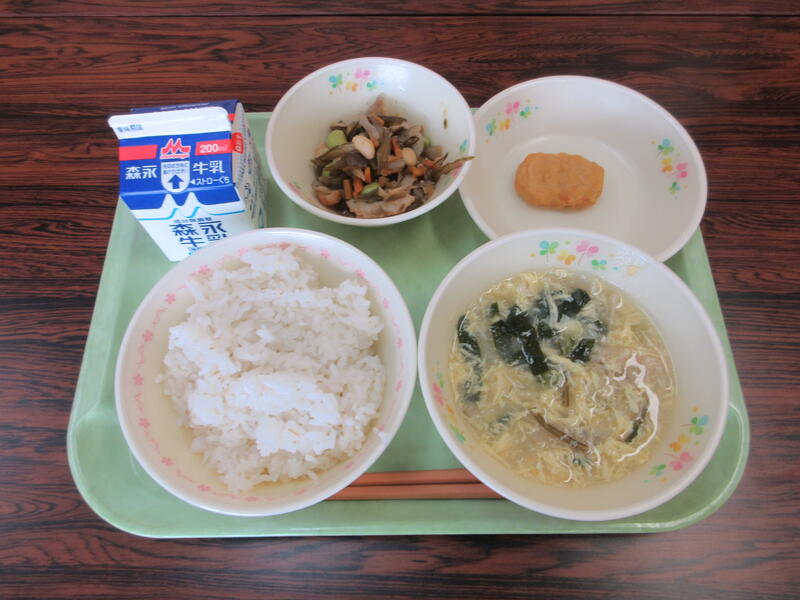 本日の献立は、麦ごはん、牛乳、かきたま汁、大豆の磯煮、チキンナゲット です。
