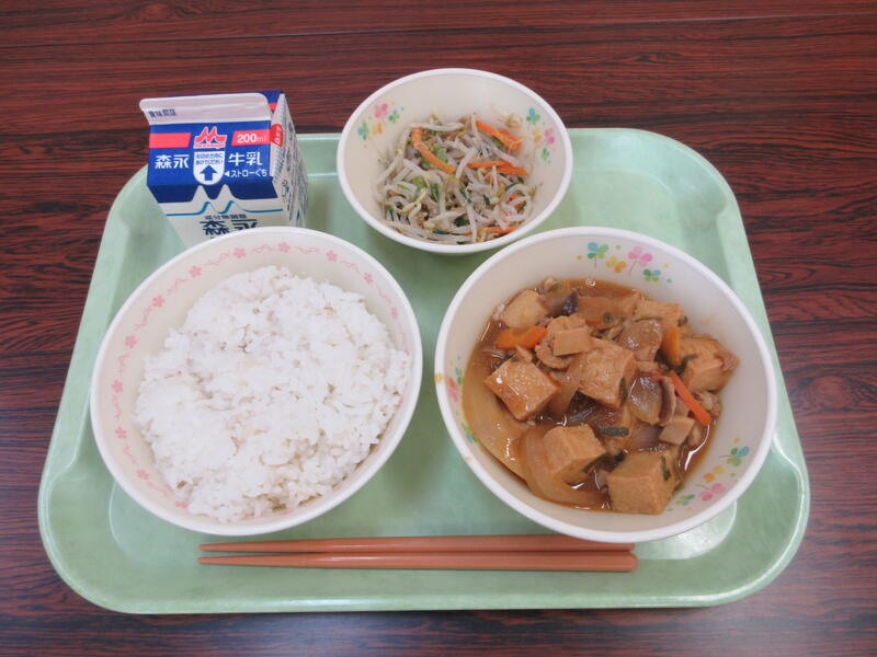 今日の献立は、麦ごはん、牛乳、家常豆腐、もやしとニラのナムル です。
