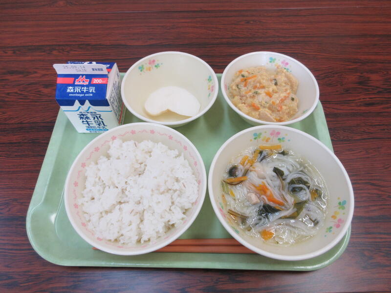 本日の献立は、麦ごはん、牛乳、ふしそうめん汁、南関揚げの卵とじ、なし です。