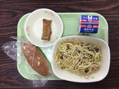 今日の献立はミニミルクパン、牛乳、冷やし中華、春巻きです。