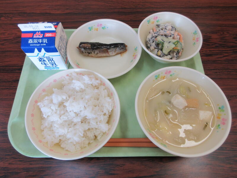 本日の献立は、麦ごはん、牛乳、呉汁、いわしのおかか煮、ひじきポテトサラダ です。