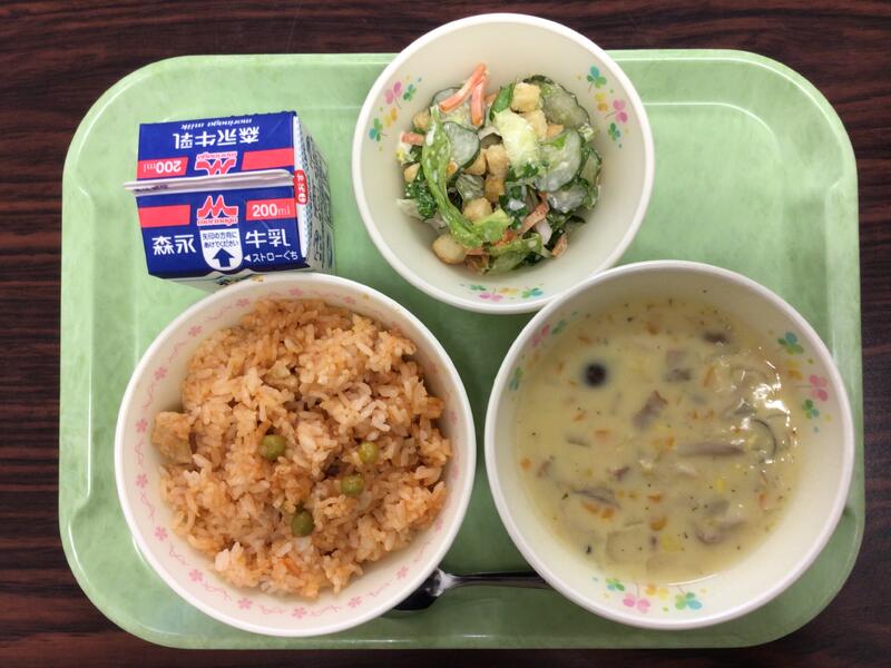 本日の献立は、チキンライス、牛乳、コーンスープ、シーザーサラダ