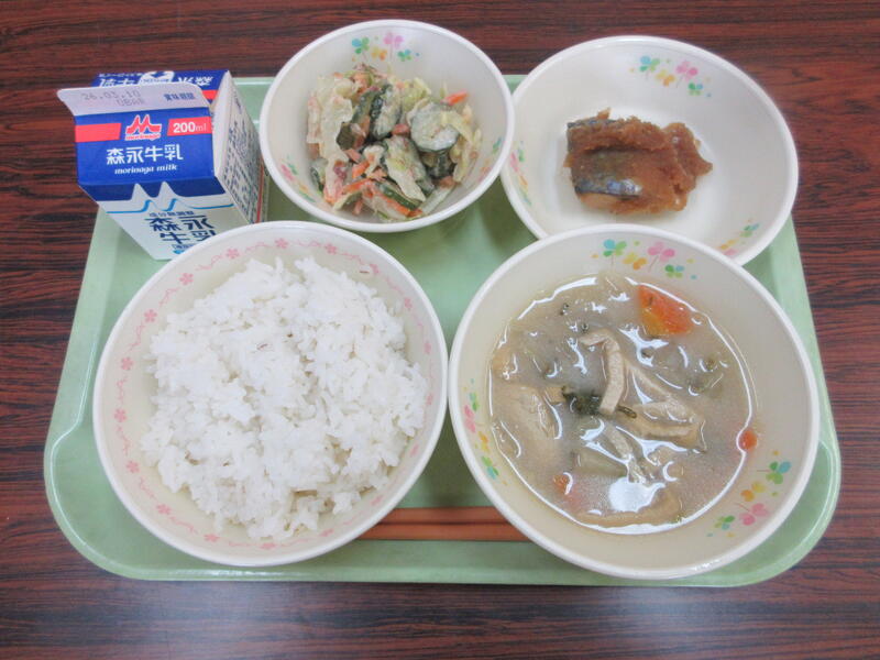 今日の献立は、麦ごはん、牛乳、なすのみそ汁、さばのみぞれ煮、野菜の梅マヨ和え です。
