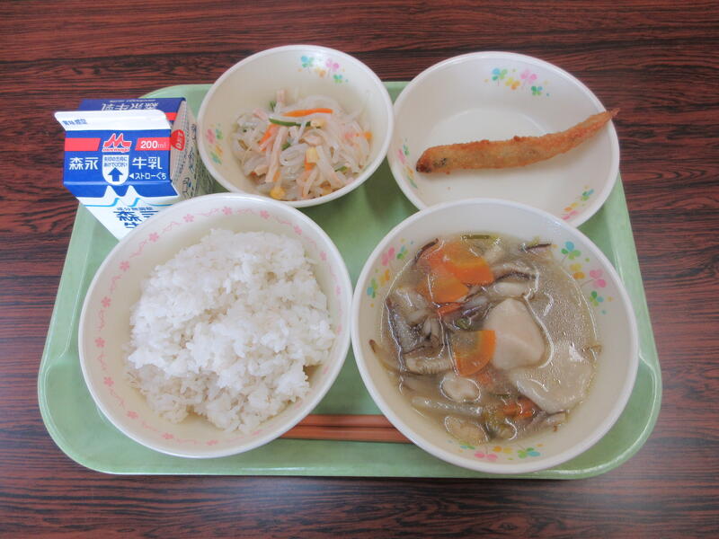 今日の献立は、麦ごはん、牛乳、だんご汁、ししゃもフライ、マロニーの和え物 です。
