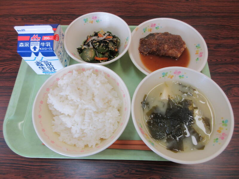 本日の献立は、新米ごはん、牛乳、玉ねぎのみそ汁、さばのみぞれ煮、野菜の磯和え です。